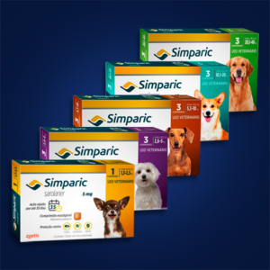 A linha Simparic é um ectoparasiticida de uso oral indicado para cães, com ação rápida e abrangente no controle de pulgas, carrapatos e ácaros causadores de sarnas. Sua fórmula à base de sarolaner oferece alta eficácia, auxiliando também no controle da dermatite alérgica à picada de pulgas (DAPP). Em comprimidos mastigáveis e de fácil administração, é uma solução moderna para proteção contínua e manejo eficiente de parasitas externos.